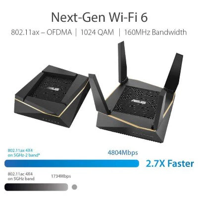 AX technology — With OFDMA and MU-MIMO, AiMesh AX6100 WiFi System enables more efficient, stable, and faster transmission even when multiple devices are transmitting data at the same time.